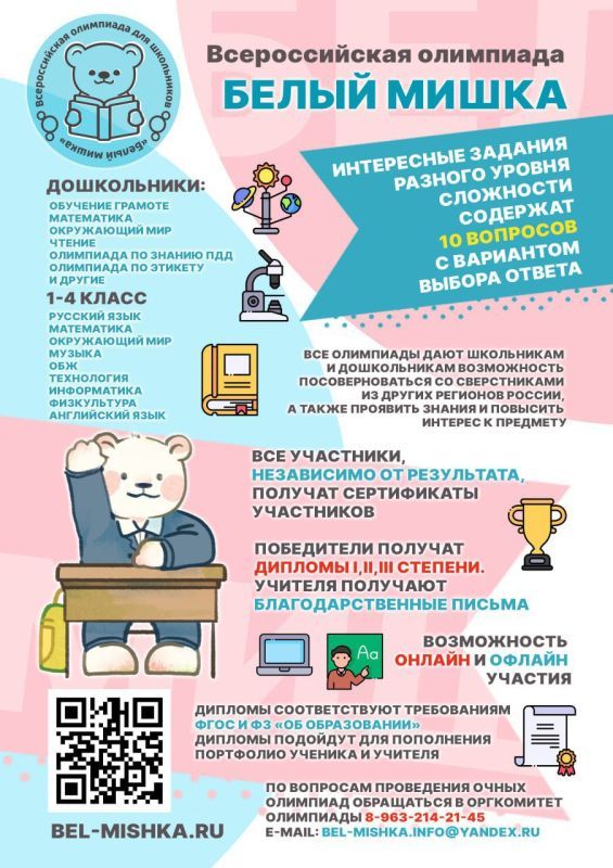 На сайте bel-mishka.ru представлены авторские олимпиады по предметам школьной программы 1-4 классов, а также тематические олимпиады для дошкольников. Задания составлены строго по требованиям ФГОС. Нестандартные и увлекательные задания олимпиады «Белый...