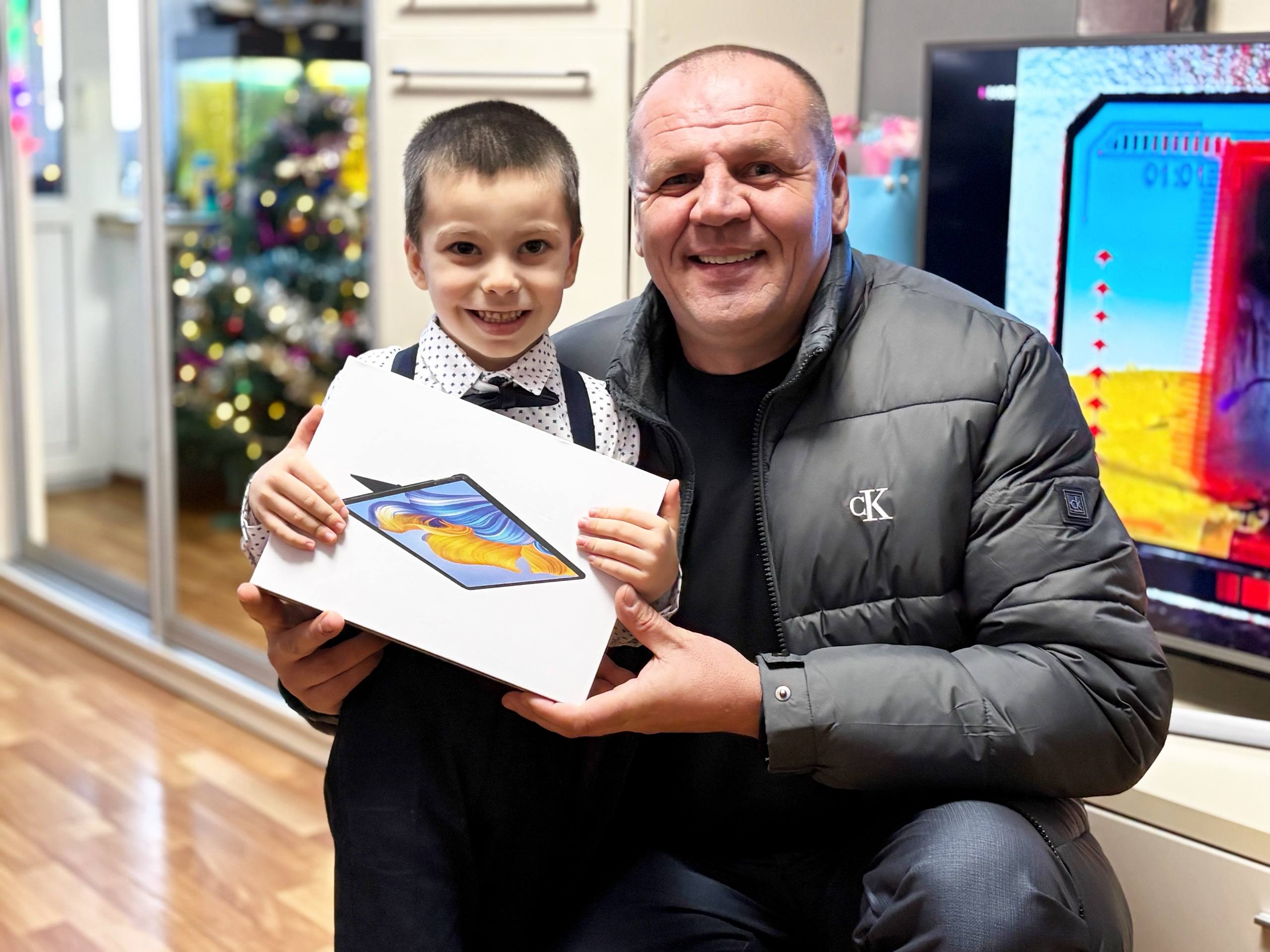 Депутат Бердянского городского совета Виктор Бардась снял шар с желанием 4летнего Николая и вручил ему подароксюрприз — планшет. Старшие дети Николая, 14летние двойняшки Марк и Виктория, получили беспроводные наушники.