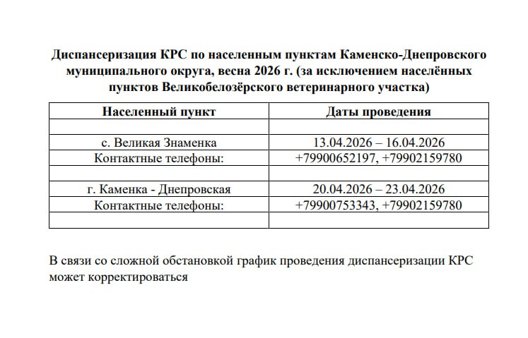 Публикуем графики весенней диспансеризации в Каменско-Днепровском и Бердянском муниципальных округах.