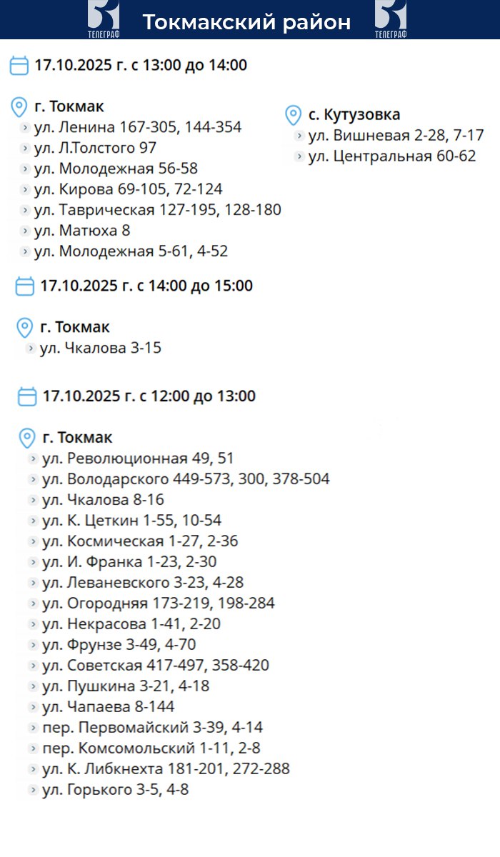 «Запорожьеэнерго» информирует о том, что в связи с проведением плановых работ будет отсутствовать электроэнергия в таких районах: