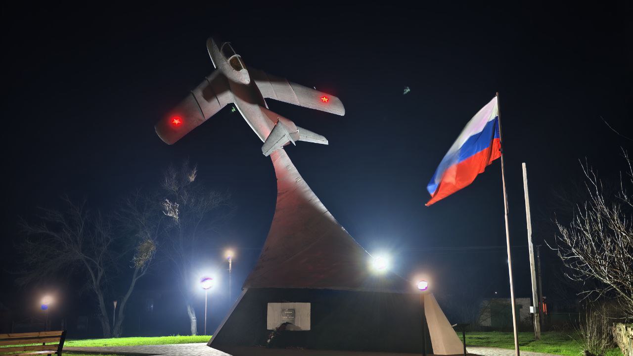 Памятник «Летчикам односельчанам в честь 50-летия Великой Победы» в селе Осипенко Бердянского района ночью. Завораживающая игра света.