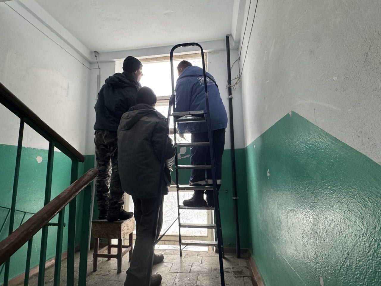 Несмотря на непогоду, сотрудники НО «ФКР МКД 30» продолжают вставлять стекла в окна домов в Бердянске, которые были выбиты в результате удара по городу, нанесенного боевиками киевскиго режима с помощью БпЛА в ночь с 9 на 10 января.