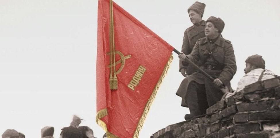 Воины Красной Армии водрузили красное знамя на древней кремлевской стене Великого Новгорода.