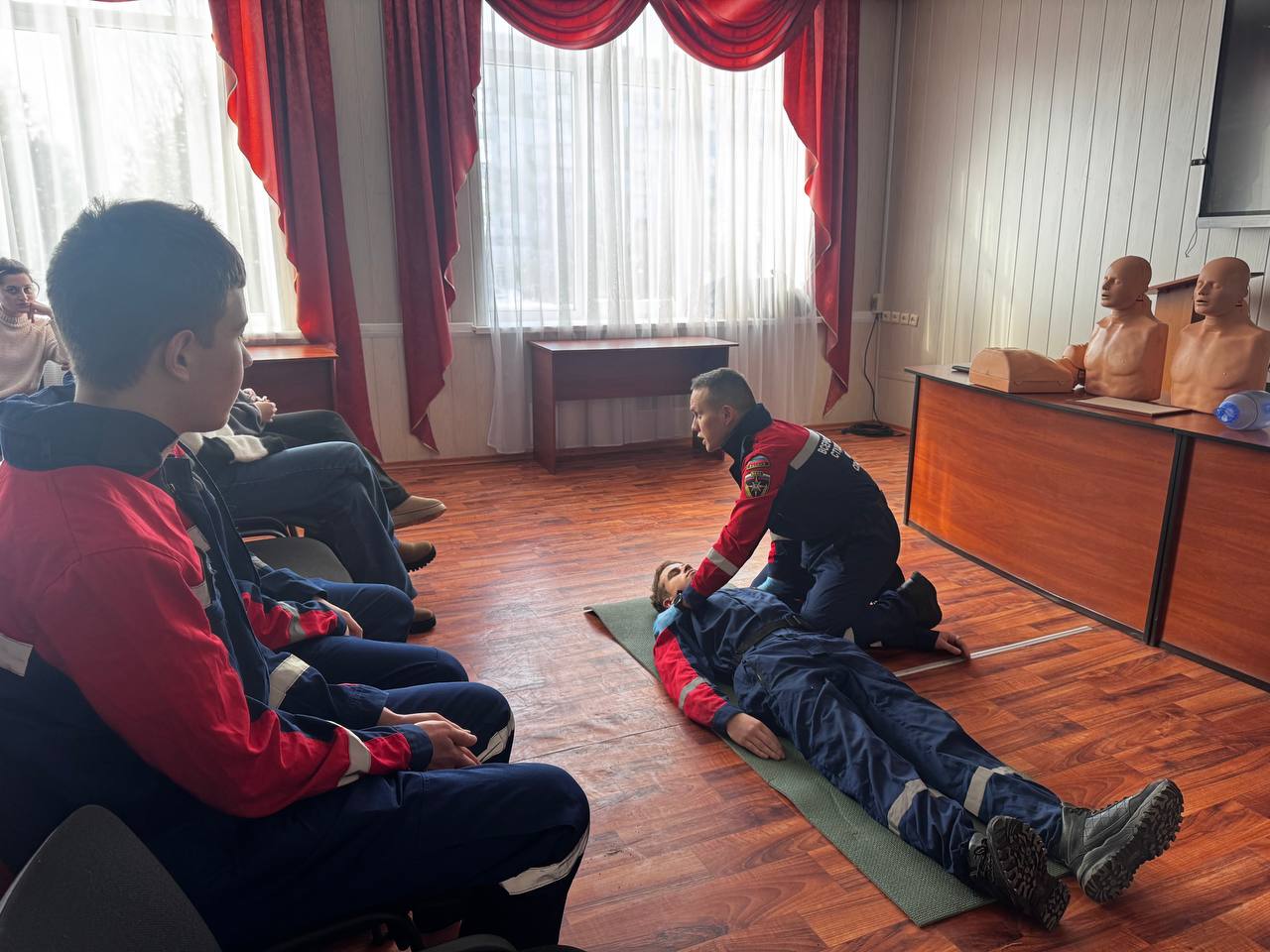Поговорили об алгоритме придания устойчивого бокового положения пострадавшему, проведении сердечно-легочной реанимации и искусственного дыхания.
