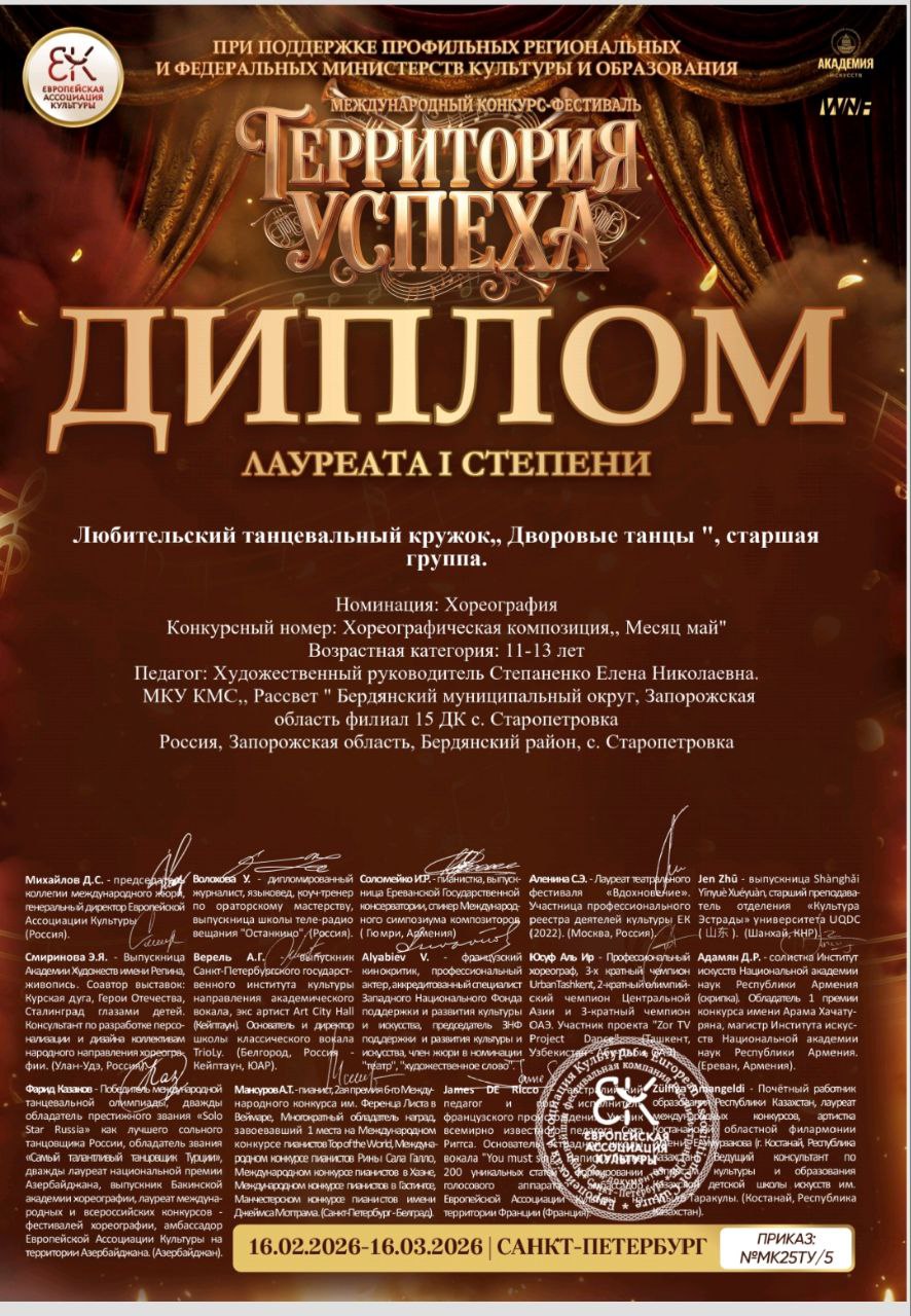 Воспитанницы любительского танцевального кружка «Дворовые танцы» Старопетровского Дома культуры по персональному приглашению Европейской Ассоциации Культуры были приглашены для участия в Международном конкурсефестивале «Территория успеха», который проходит один раз в три года.