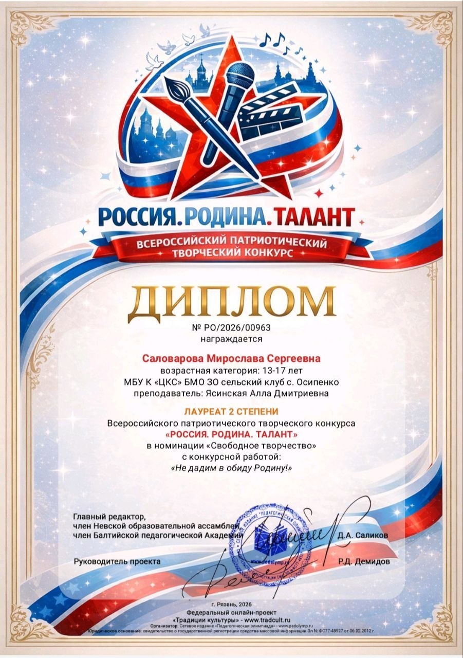 Саловарова Мирослава удостоена диплома лауреата 2-й степени в номинации «Свободное творчество» за работу «Не дадим в обиду Родину!». Вокальный коллектив «Барбарики» получил диплом лауреата 2-й степени в номинации «Вокальный жанр» за песню «Наш мир». Хореографический коллектив «Грация» стал обладателем диплома лауреата 3-й степени в номинации «Танцевальный жанр» за постановку «Огненная симфония». Кроме того, ещё один танцевальный коллектив завоевал диплом лауреата 1-й степени в номинации «Танцевальный жанр» за танец «Ангелы».